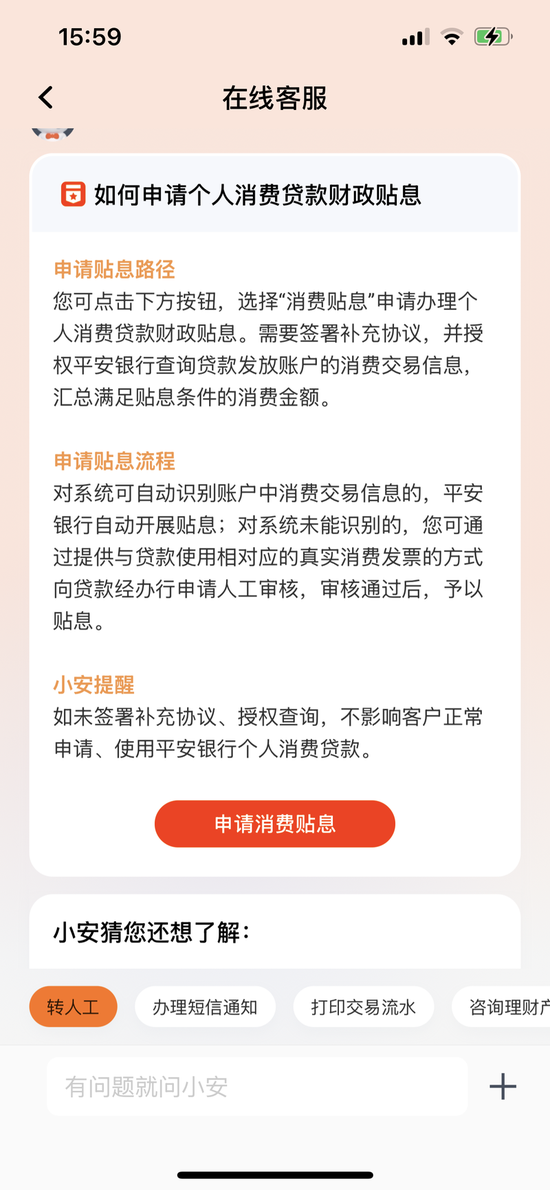 贝壳财经记者发现,平安银行、广发银行等多家银行在手机银行App智能客服回答“如何申请个人消费贷款贴息”时,嵌入了“申请贴息”的按钮。点击相关按钮,即可进入申请页面。